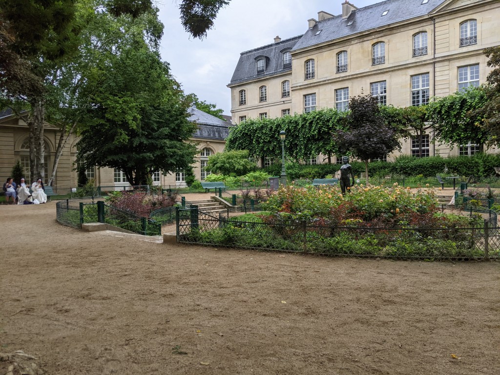 Two days ago, on a Sunday, I walked through the Paris Jewish Quarter, shawarma in hand and looking for somewhere to sit and eat without having to resort to squatting in the shade of a doorstep and nibbling at my pita and rotisserie like some maniac. A light, whisping drizzle descended on both me and my food, and finally I came upon the Square Georges-Cain right off of rue Payenne and across the street from the Carnavalet Museum. The park was named after one of the museum’s early curators. There are a good number of small parks dotting the landscape of Paris, but this one holds a special, beatific experience for visitors. The surrounding walls are plastered with anarchic examples of sculptures and reliefs from all over Paris, including from the old town hall and the Tuileries Palace. The corner is shaded with an enormous, 19-foot tall fig tree.